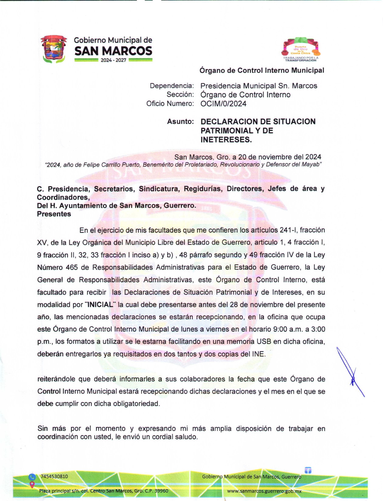 Dar clic aqui para descargar el oficio dirigido por el Organo de Control Interno Municipal.